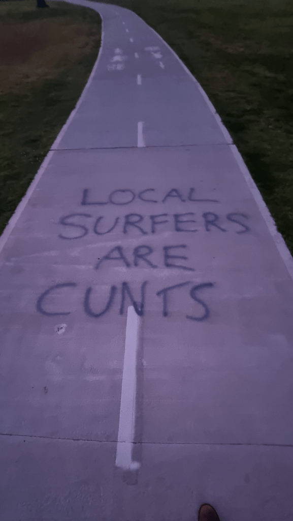 Now though, it appears blow ins have hit back, with an image also recently uploaded to Reddit showing graffiti reading: “Local surfers are cunts” alongside the caption “cop that local surfers.”